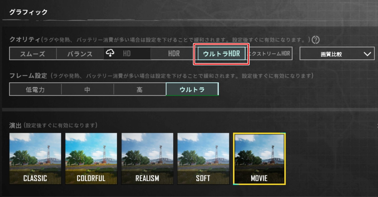 まずグラフィッククオリティに関しては、現時点で最高設定の『ウルトラHDR』を選択できた。