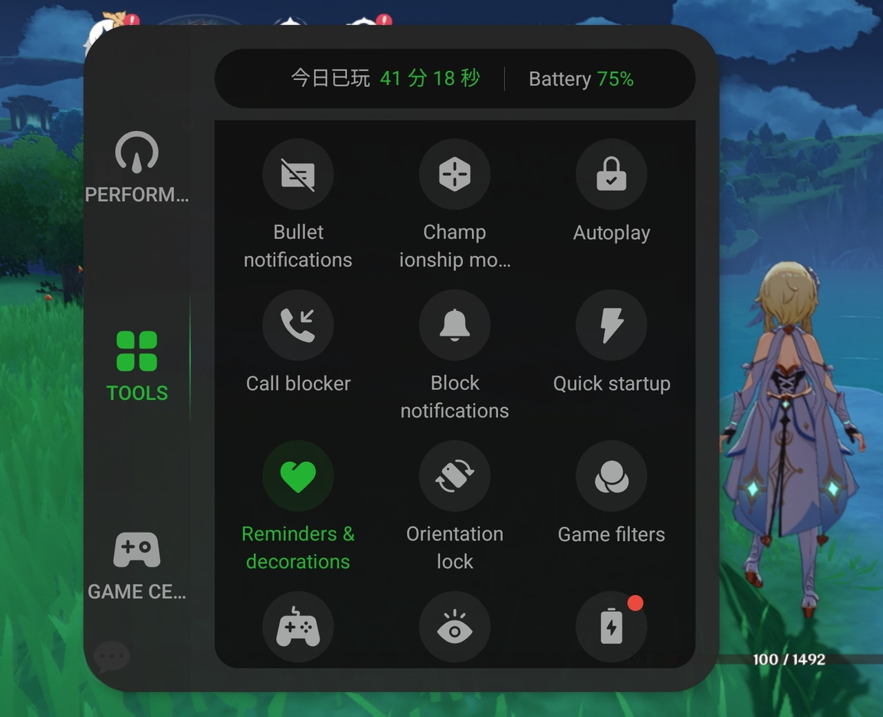 ゲームアプリプレイ時に、ディスプレイ端を中央に向けてスワイプすることで、ゲーミング用のツールウィンドウを表示できる。