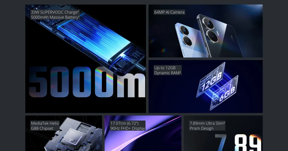 Realme Narzo N55は、6.7インチのHD+ディスプレイ、MediaTek Helio G88プロセッサー、4GBのRAM、64GBの内部ストレージを搭載しています。また、5000mAhのバッテリーと、64MPのリアカメラと8MPのフロントカメラも備えています。