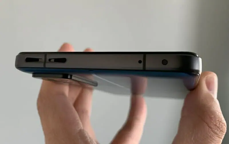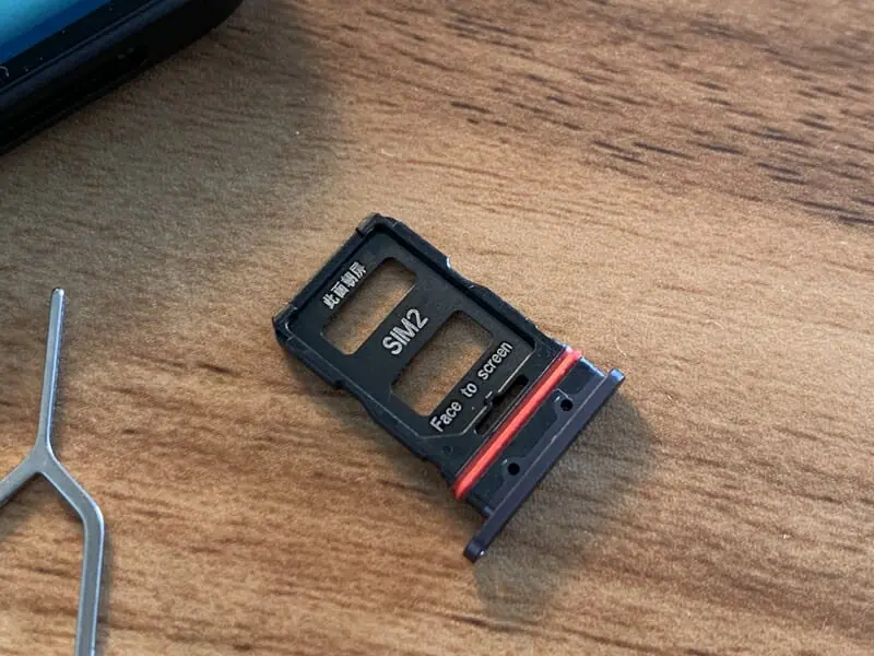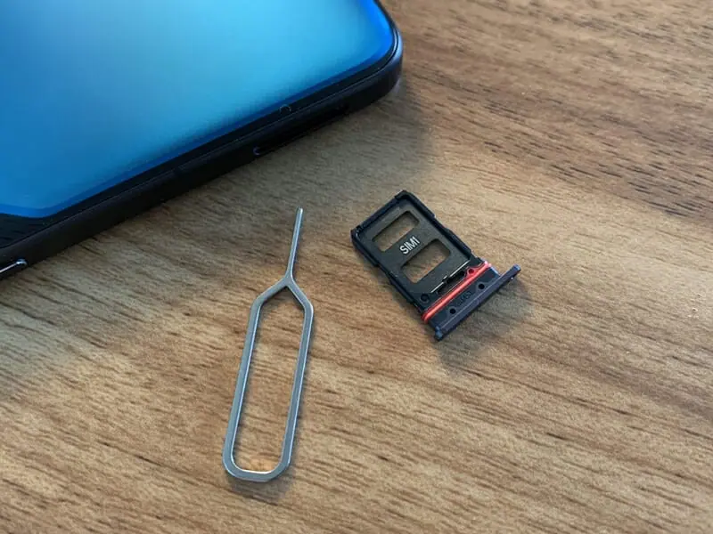 ▼付属のピンを用いてスロットを開き、デュアルnanoSIMカードの挿入が可能となる。