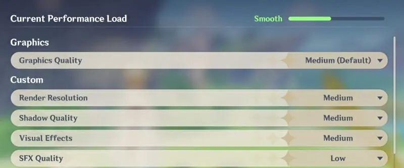 ▼画質設定はデフォルト状態で "中" に設定されており、デバイス負荷は "スムーズ" の状態。