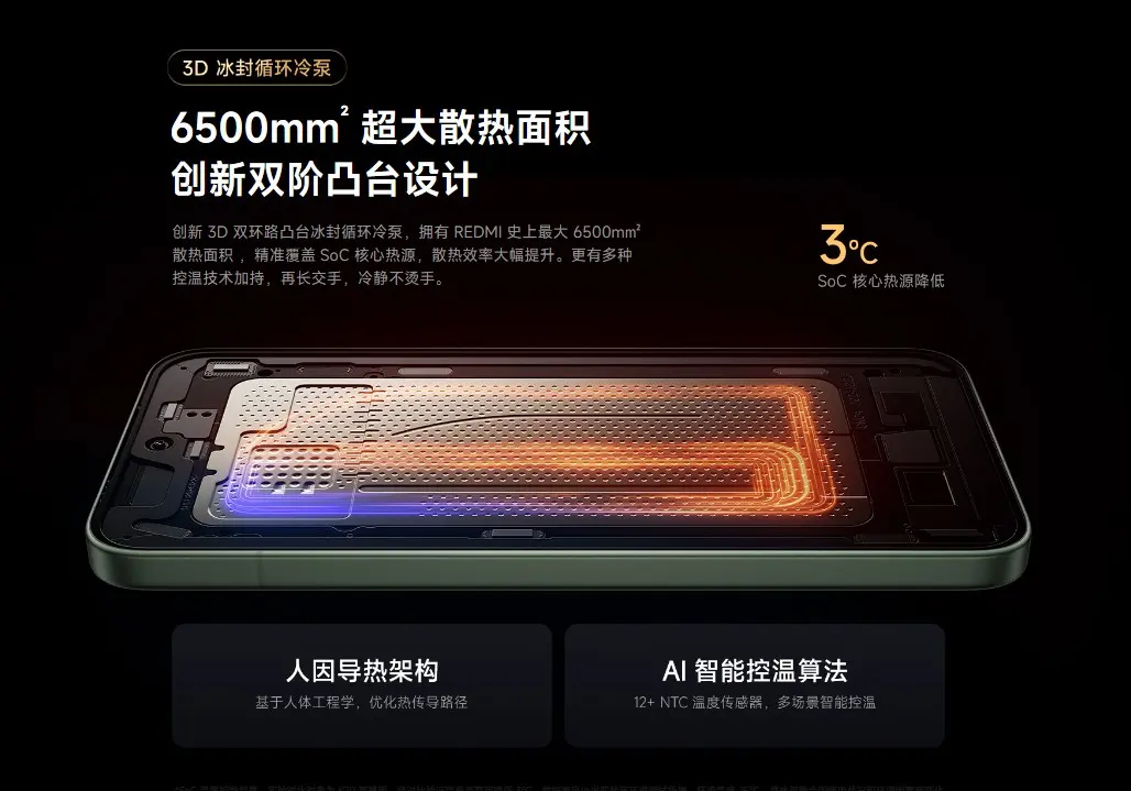 冷却機構に関しては、6500mm²の巨大ベイパーチャンバーと3Dダブルループ設計の冷却ポンプを採用。SoCの熱を効率よく分散することで、前世代機より最大3℃低温に抑える性能を実現し、長時間の高負荷利用時でも、発熱によるパフォーマンスへの影響を防ぎます。
