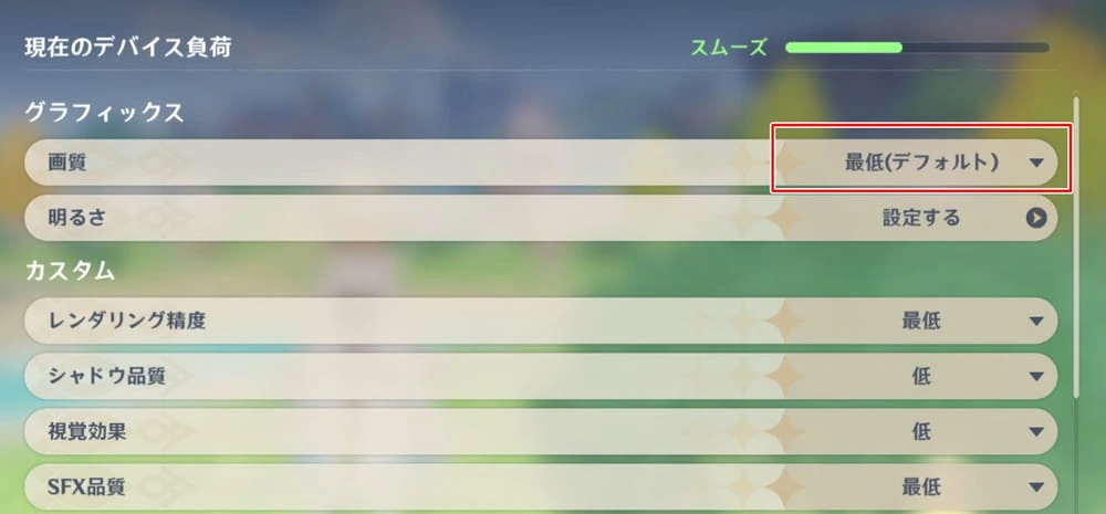 ▼画質設定はデフォルト状態で "最低" に設定されており、デバイス負荷は "スムーズ" の状態。