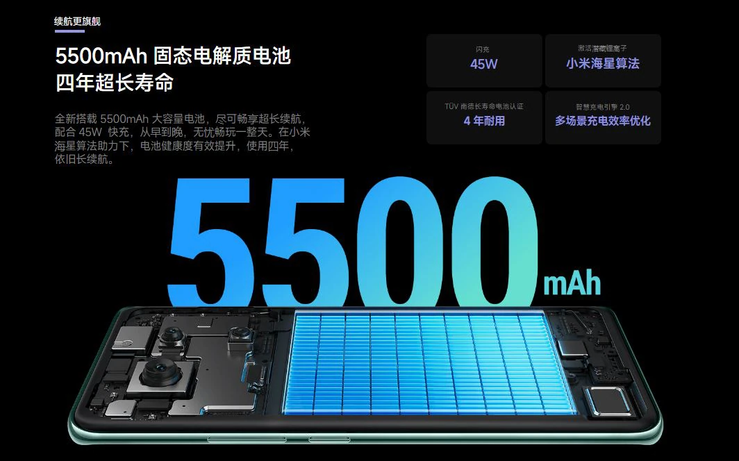 5,500mAh (45W急速充電)のバッテリーを内蔵。長時間の連続使用、および短時間での充電が可能です。