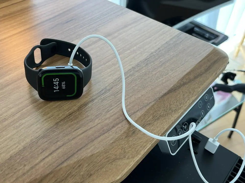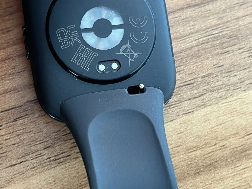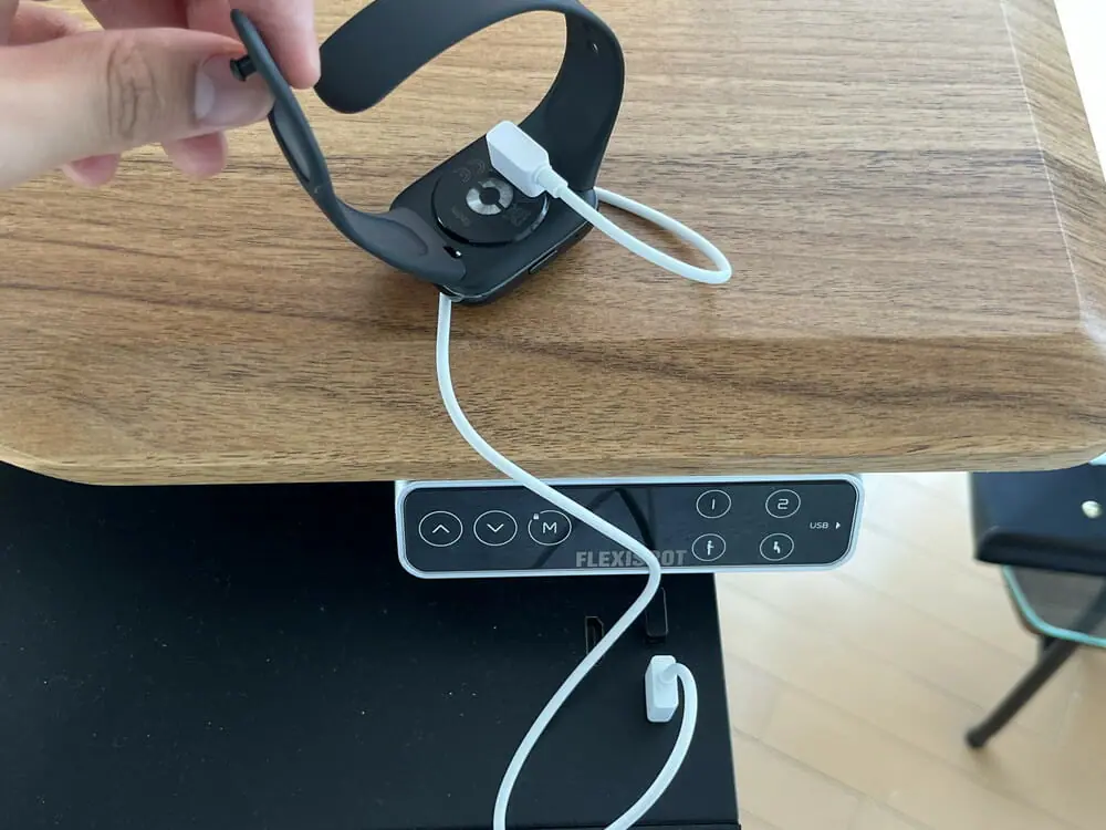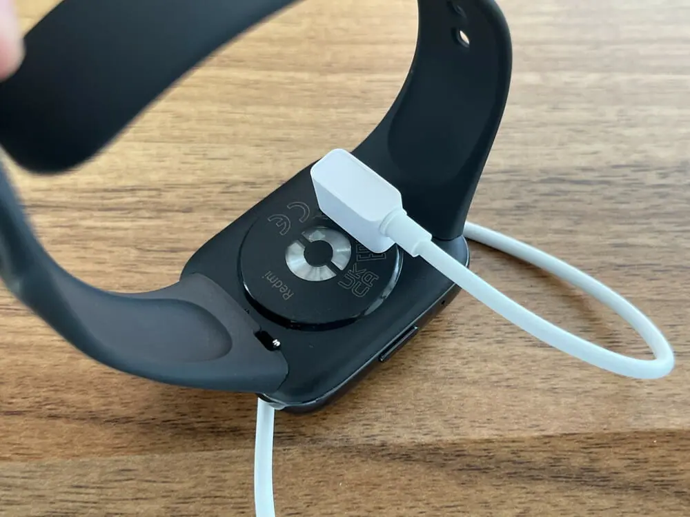 充電の際は、スマートウォッチ背面のポートにケーブル端子を近づけるだけでカチッと磁石で吸着し、充電が開始される。