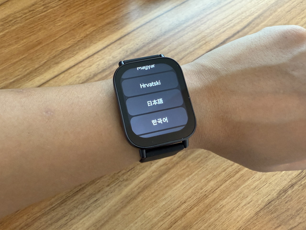 側面のアクションボタンを長押しするとスマートウォッチが起動し、ペアリングスタンバイ状態となる。インターフェースは当然、日本語にも完全対応している。
