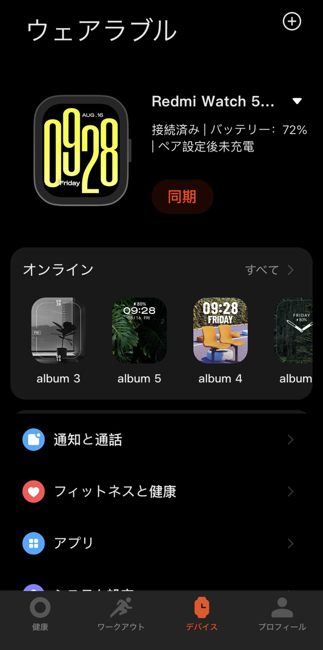 ▼ウィジェット選択画面。画面が大きくて操作しやすい。ただ、『Redmi Watch 5 Lite』の有機EDディスプレイと比べると、さすがに画質がやや荒く、発色も弱めに感じられる。