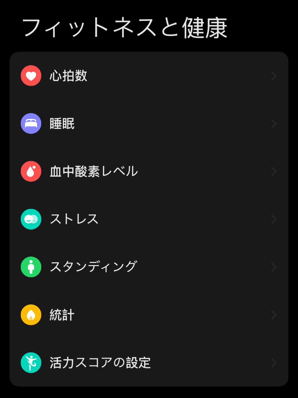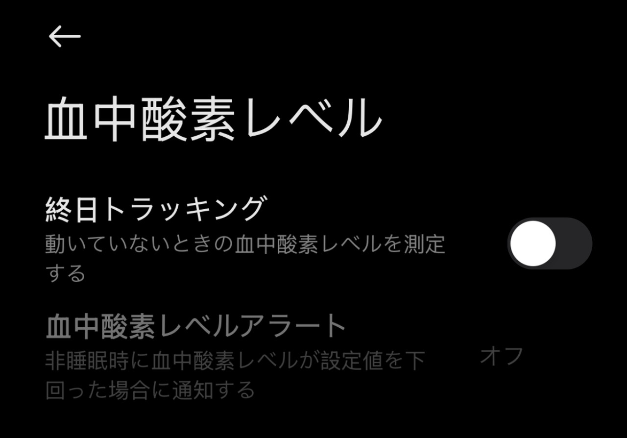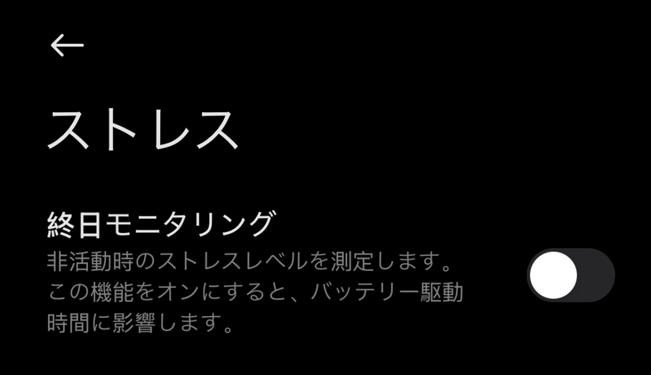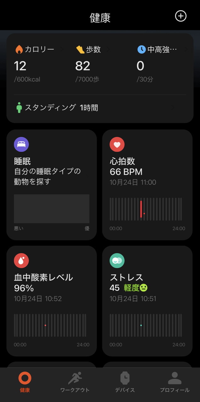 本製品には健康モニタリング機能が備わっており、ストレス・睡眠・心拍数・血中酸素飽和濃度などの数値を24時間監視(トラッキング)し、データとして可視化・保存しておくことが出来る。