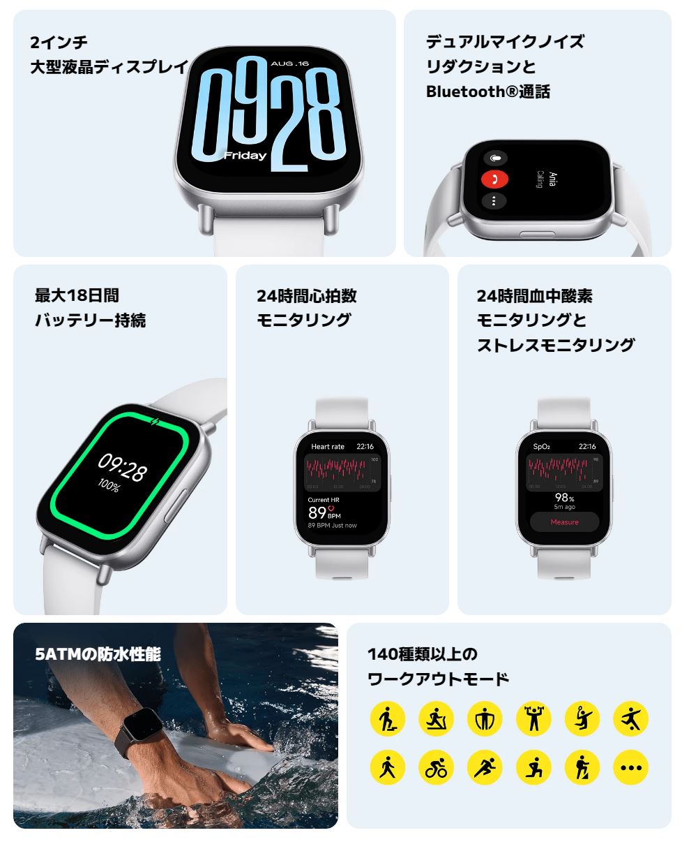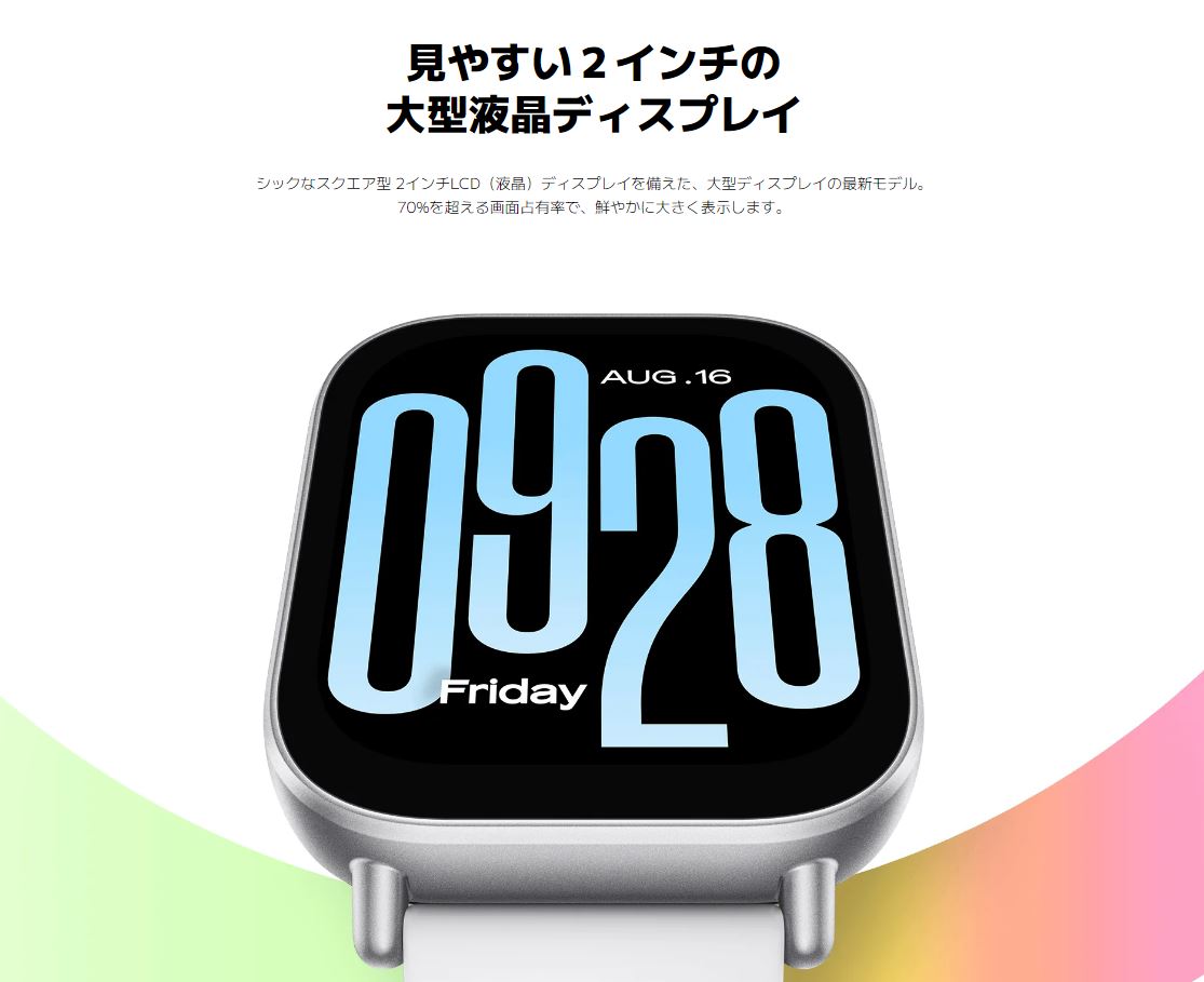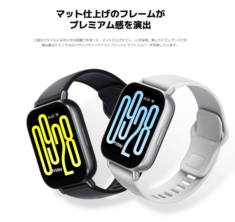 同日に発売された『Redmi Watch 5 Lite』の廉価版モデルであり、2インチの大型LCD(液晶)を搭載。最大18日間の連続使用が可能なバッテリーを内蔵、マイク&スピーカー内蔵でウォッチ越しでの通話も楽しめるなど、リーズナブルな価格に対して比較的優れたパフォーマンスを発揮するモデルとなっている。
