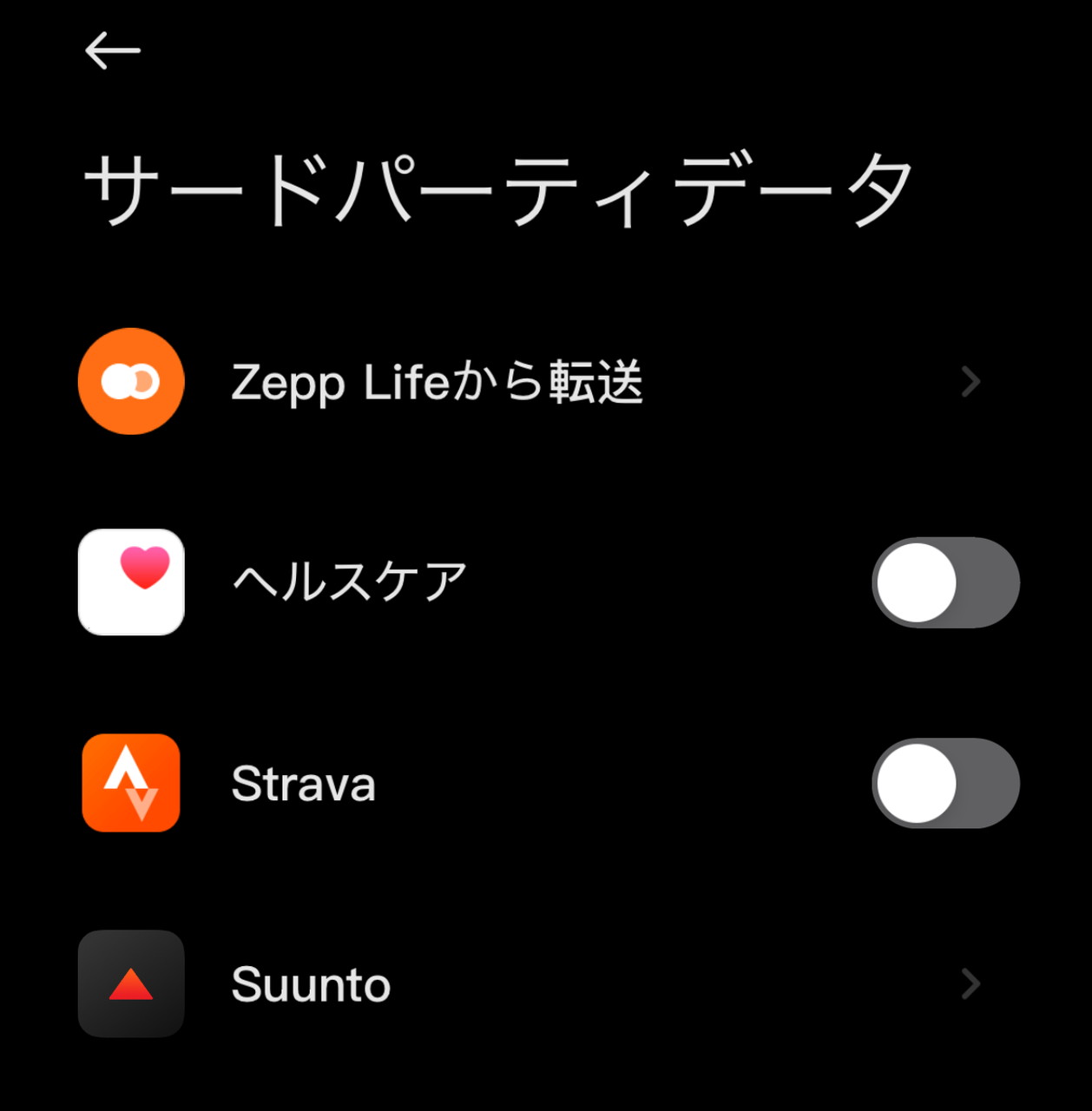 Mi FitnessアプリはヘルスケアやStrava、Suuntoといったサードアプリとの連携に対応しており、今までに記録してきた健康データ、運動データを共有できる。
