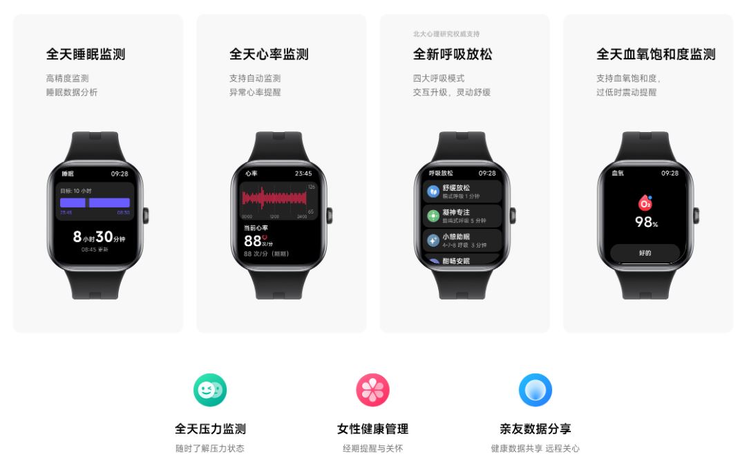 女性の生理周期リマインダーや呼吸トレーニング機能も搭載され、24時間の健康サポート機能が充実している。