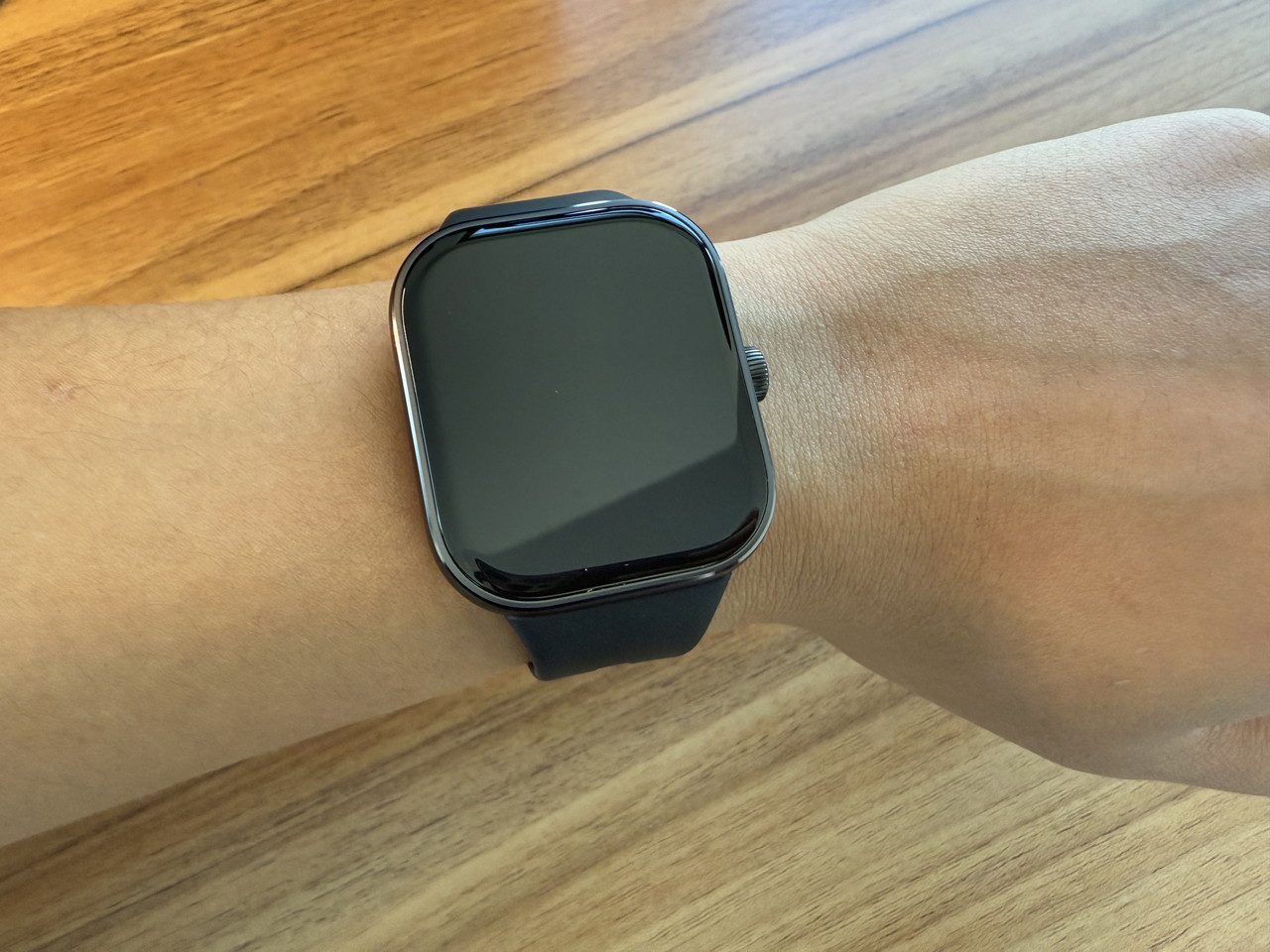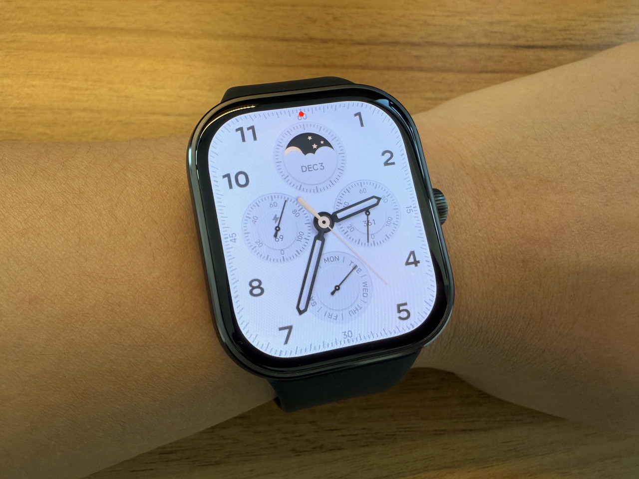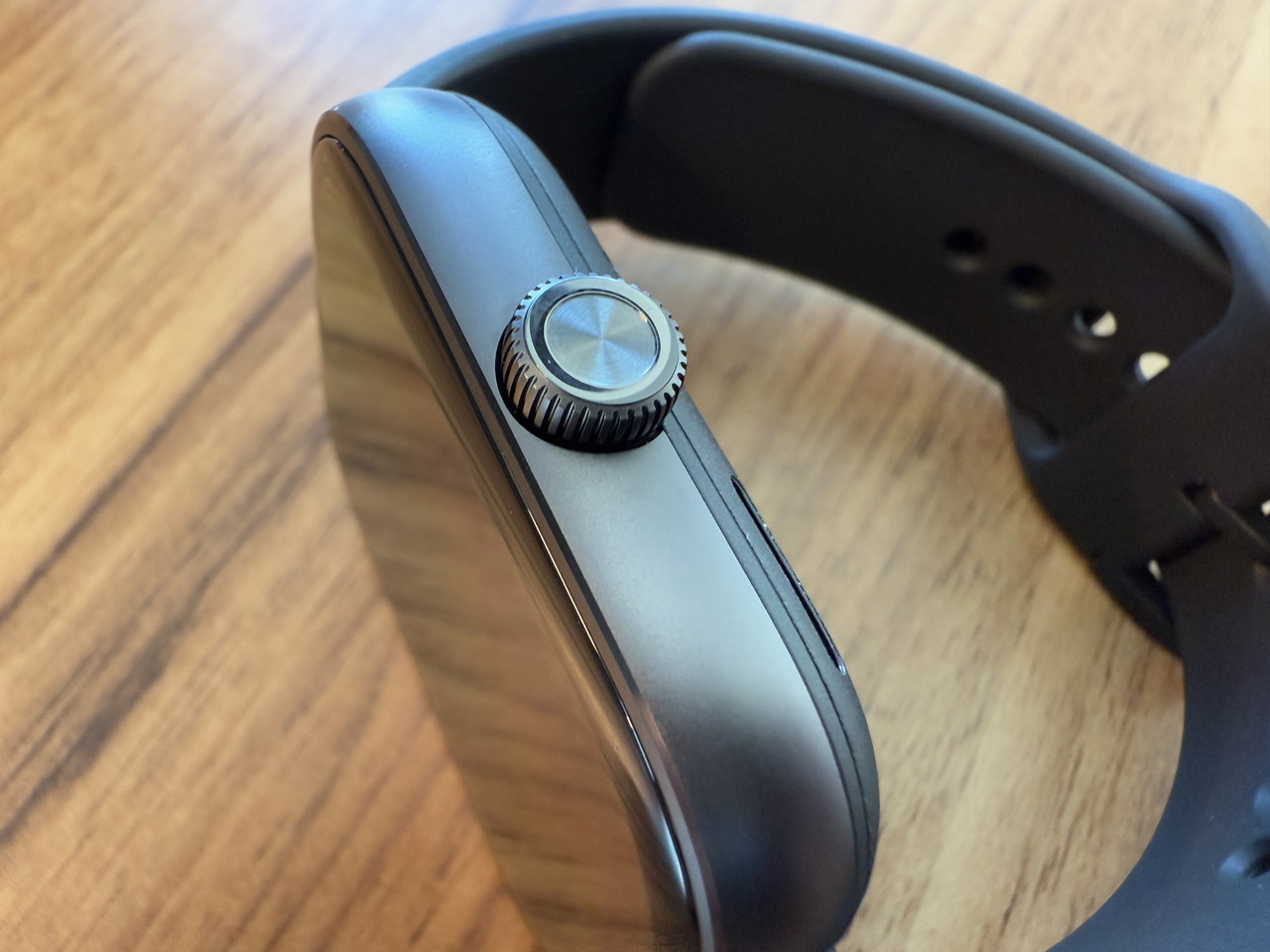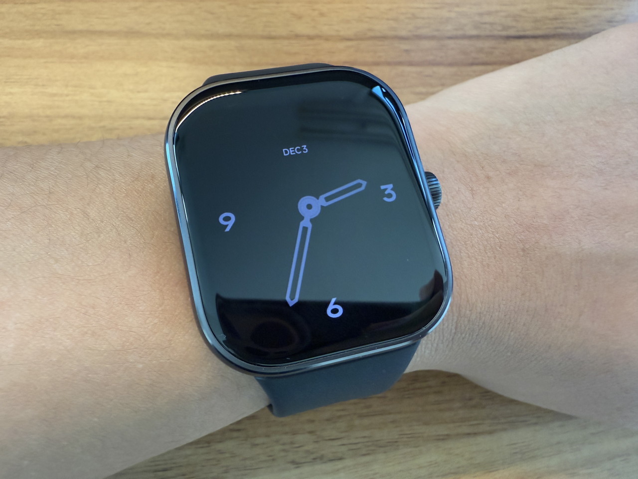 アルミニウム合金ミドルフレーム + ステンレススチールクラウンで構成されたウォッチ本体部分には、そこそこの高級感がある。デザイン的にもシンプルかつスタイリッシュなため、職場やビジネスの場に装着して行っても違和感はないだろう。