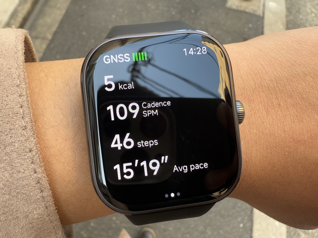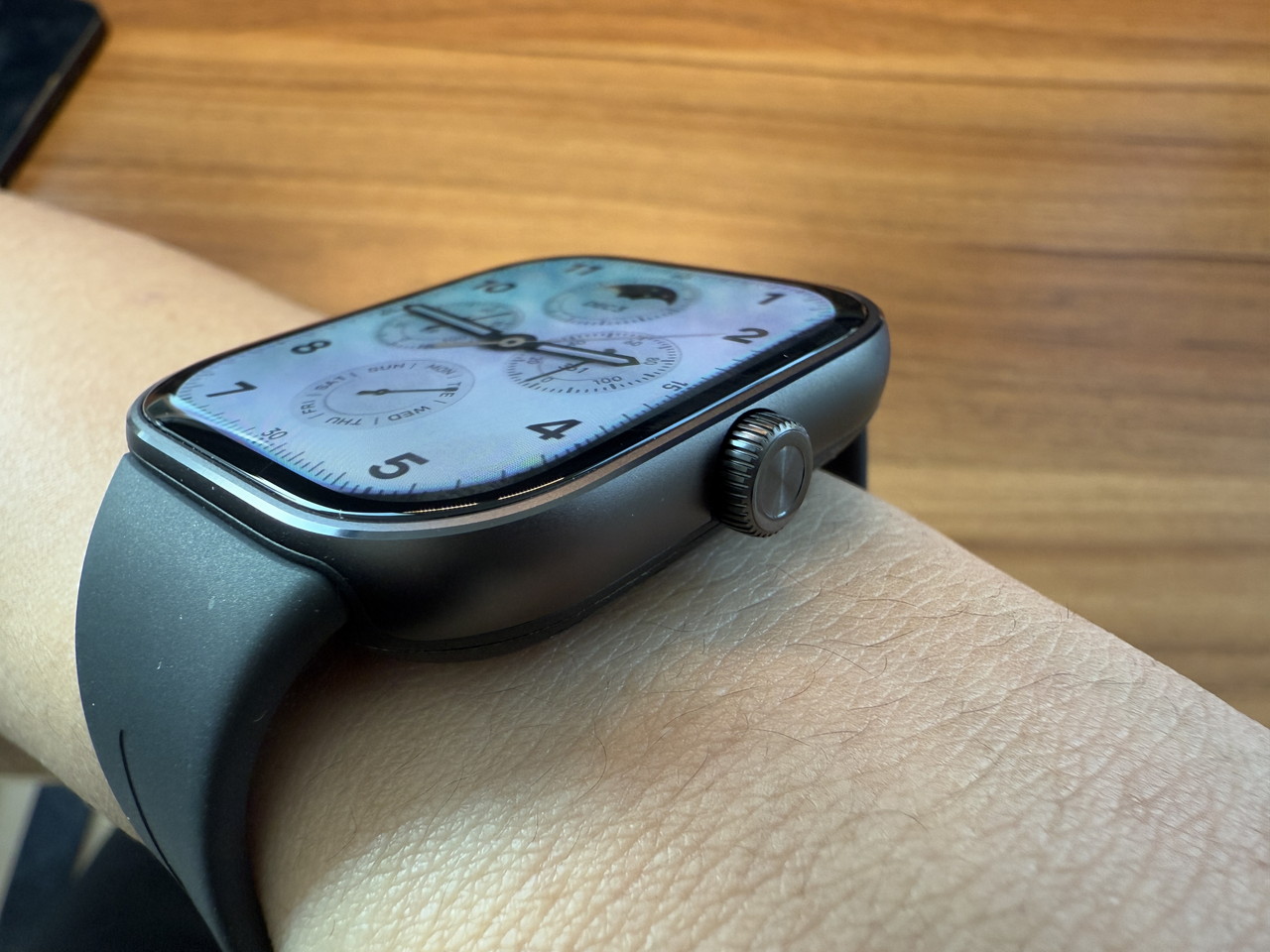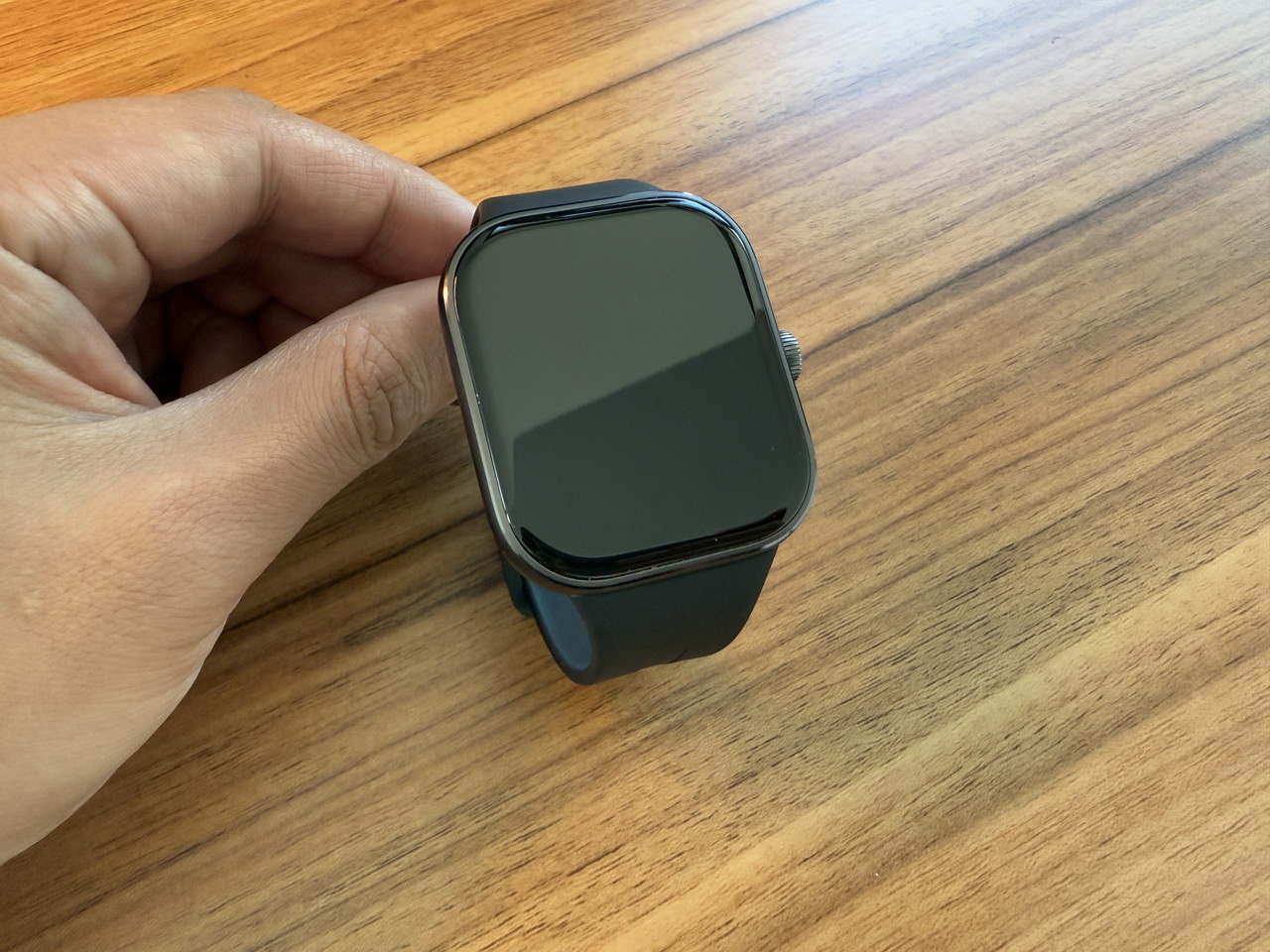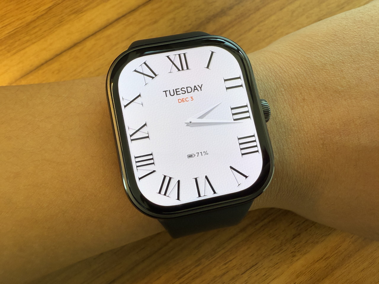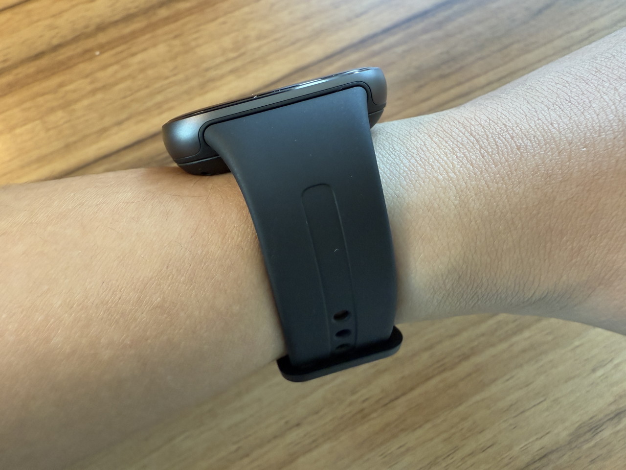 アルミニウム合金ミドルフレーム + ステンレススチールクラウンで構成されたウォッチ本体部分には、そこそこの高級感がある。デザイン的にもシンプルかつスタイリッシュなため、職場やビジネスの場に装着して行っても違和感はないだろう。