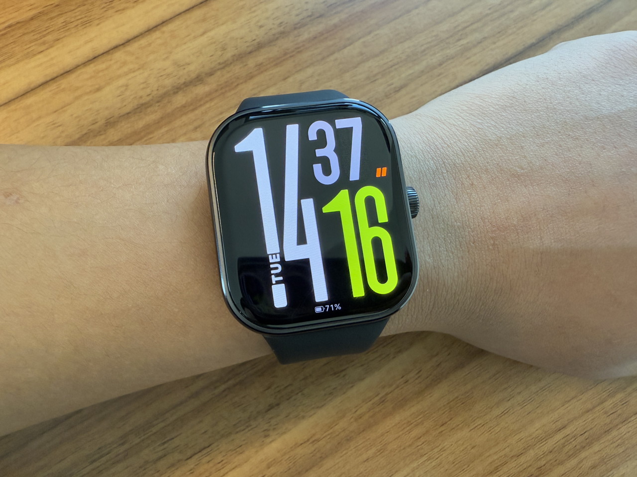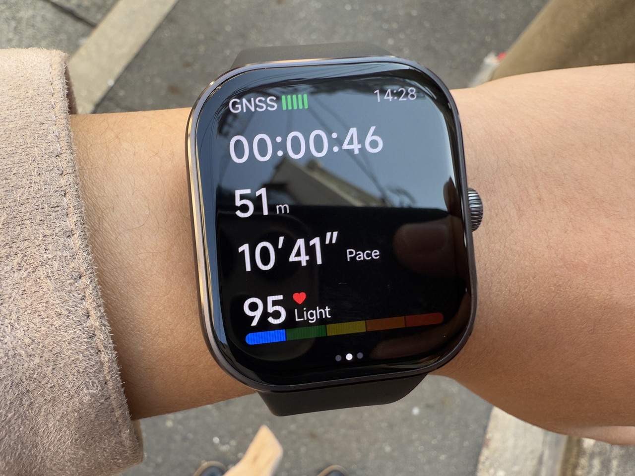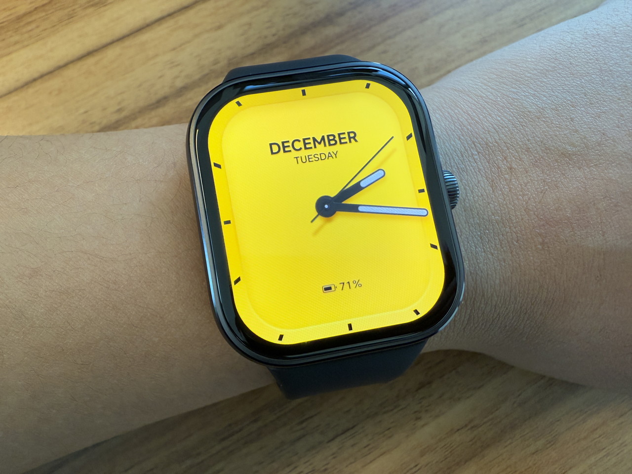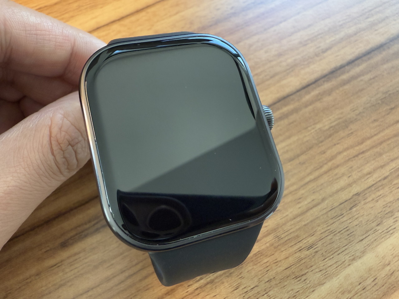アルミニウム合金ミドルフレーム + ステンレススチールクラウンで構成されたウォッチ本体部分には、そこそこの高級感がある。デザイン的にもシンプルかつスタイリッシュなため、職場やビジネスの場に装着して行っても違和感はないだろう。