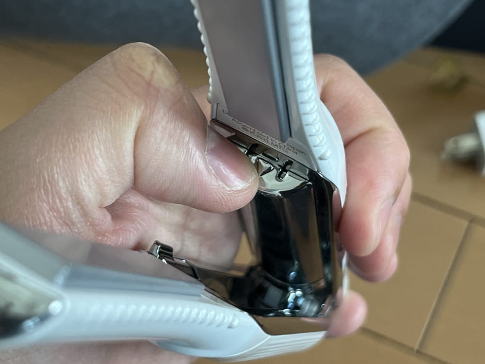 開閉スイッチを解除側に入れると、アイロンが展開され使用形態となる。