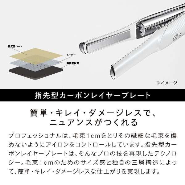 カーボンレイヤープレートはベースに高密度炭素を使用。髪にムラなく熱を伝えてキレイな形をつくり出す。