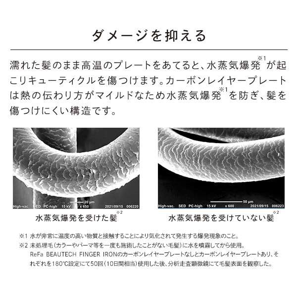 濡れた髪のまま高温のプレートをあてると、水蒸気爆発が起こりキューティクルを傷つける。しかし『ReFaフィンガーアイロン』のカーボンレイヤープレートは熱の伝わり方がマイルドなため、水蒸気爆発を防ぎ、髪を傷つけにくい。