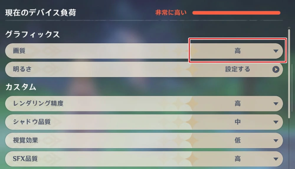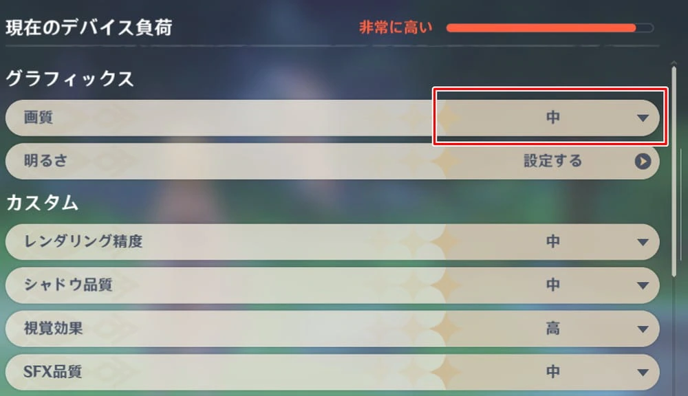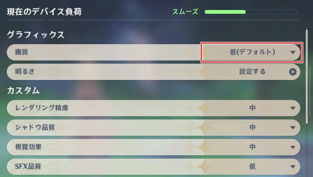画質設定はデフォルト状態で "低" に設定されており、デバイス負荷は "スムーズ" の状態であった。