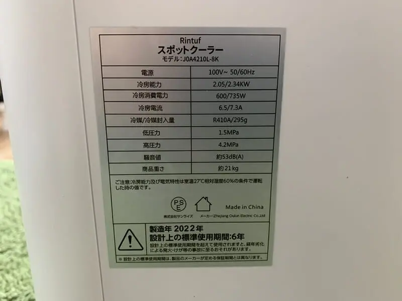 2.05kW(50Hz)2.34kW(60Hz)の冷房能力を擁しており、目安として7.3畳前後の広さの空間を涼しく保つことが出来る。家庭用の100Vコンセントさえあれば動作出来る点も嬉しい。