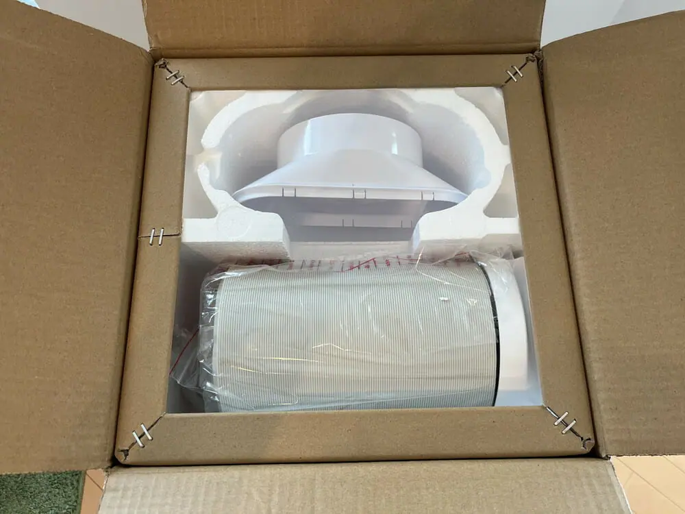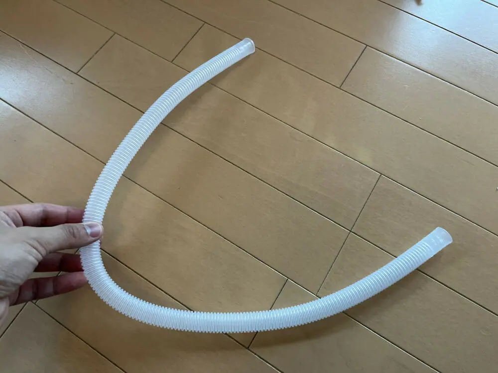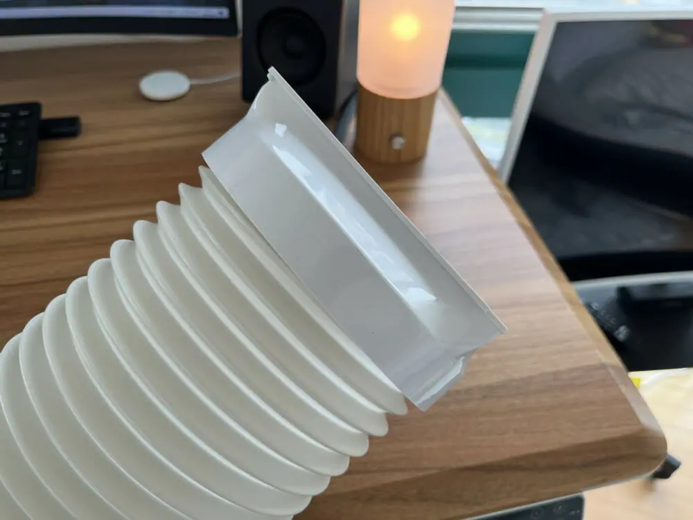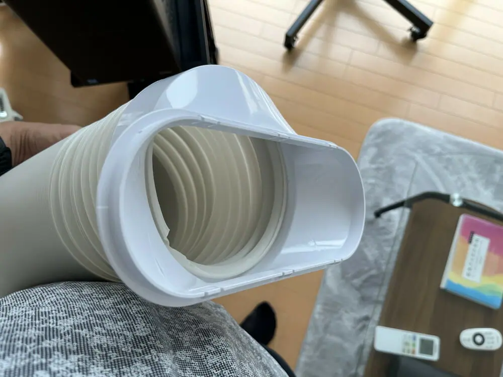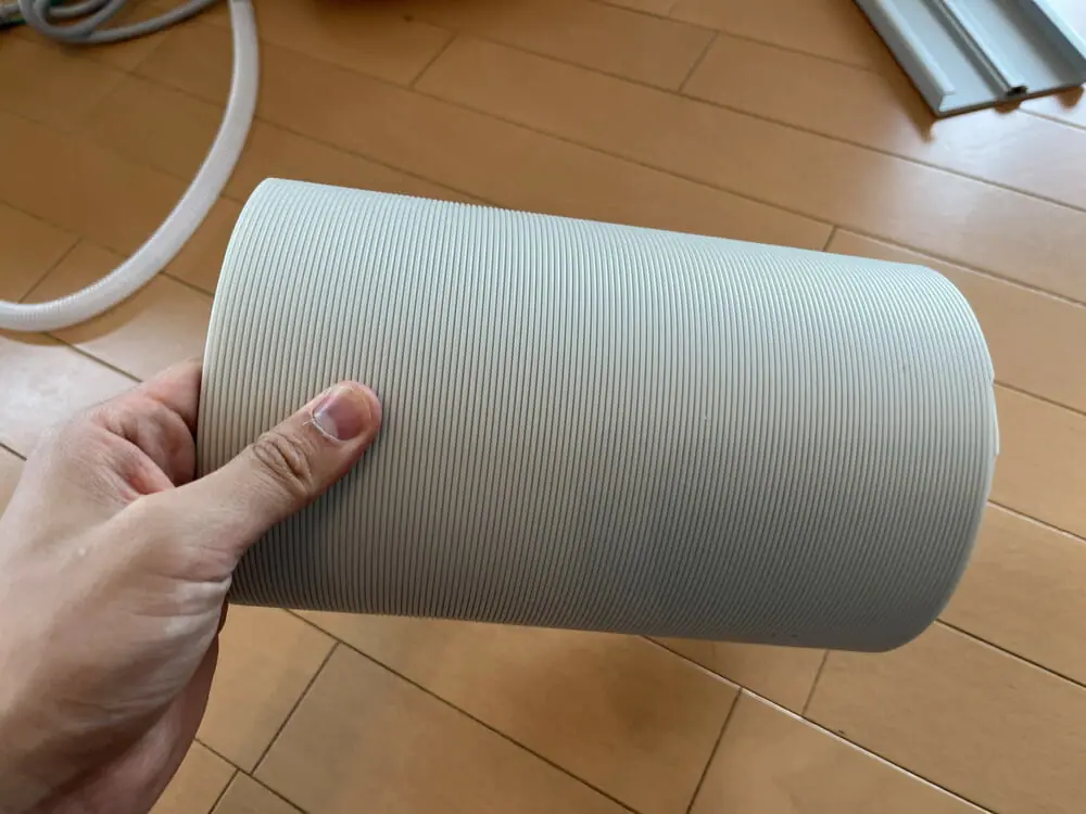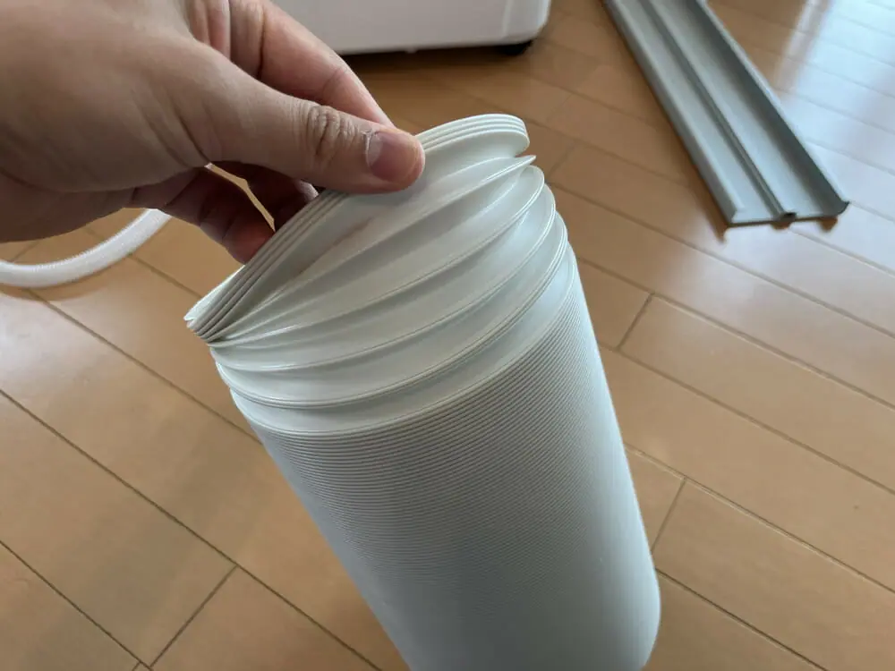 ▼排熱ダクトは蛇腹状に折りたたまれており、引っ張ることで延長が可能だ。