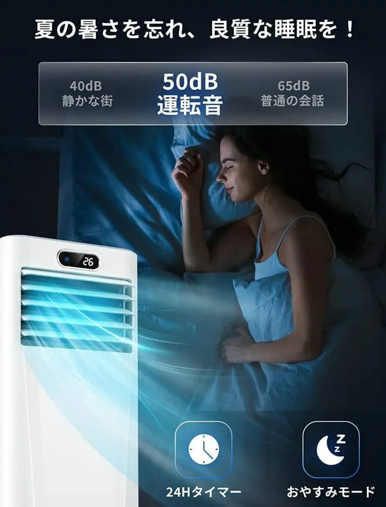 通常のエアコンと大差ない冷却能力を備えたうえで、静音性も併せ持っており、夜間も睡眠に支障をきたすことなく使用できるだろう。