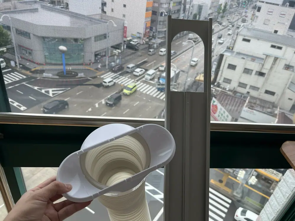 取付後、窓枠に『窓パネル&レール』を取り付けた状態の排熱ダクトを設置し、外部へ排熱口を出す準備を整える。