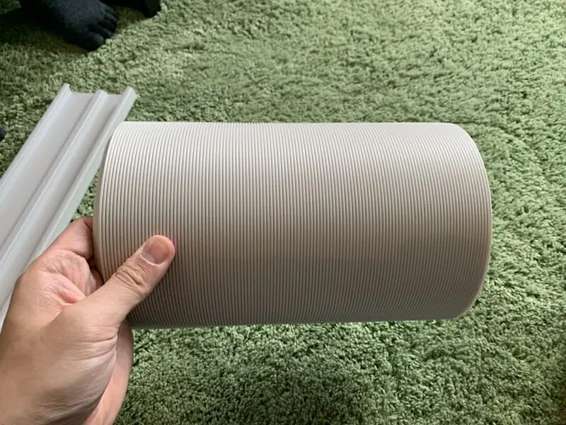 ▼排熱ダクトは蛇腹状に折りたたまれており、引っ張ることで延長が可能だ。