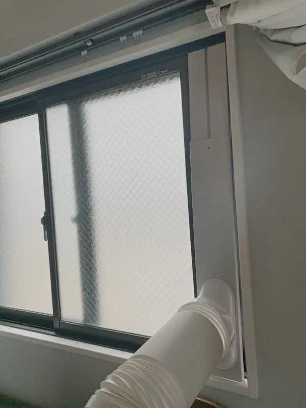 取付後、窓枠に『窓パネル&レール』を取り付けた状態の排熱ダクトを設置し、外部へ排熱口を出す準備を整える。