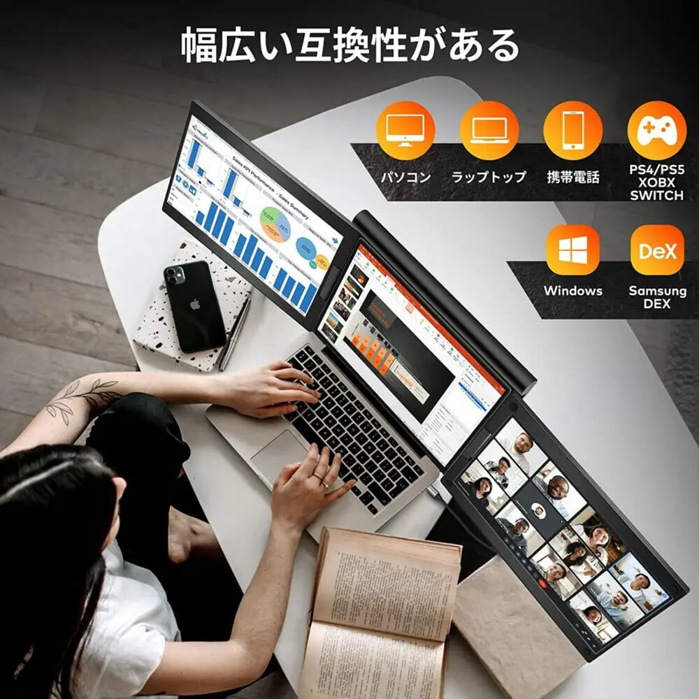 本製品は、Type-Cケーブル一本でノートPCの映像を最大2画面へ同時出力できる、トリプル ポータブルモニターです。