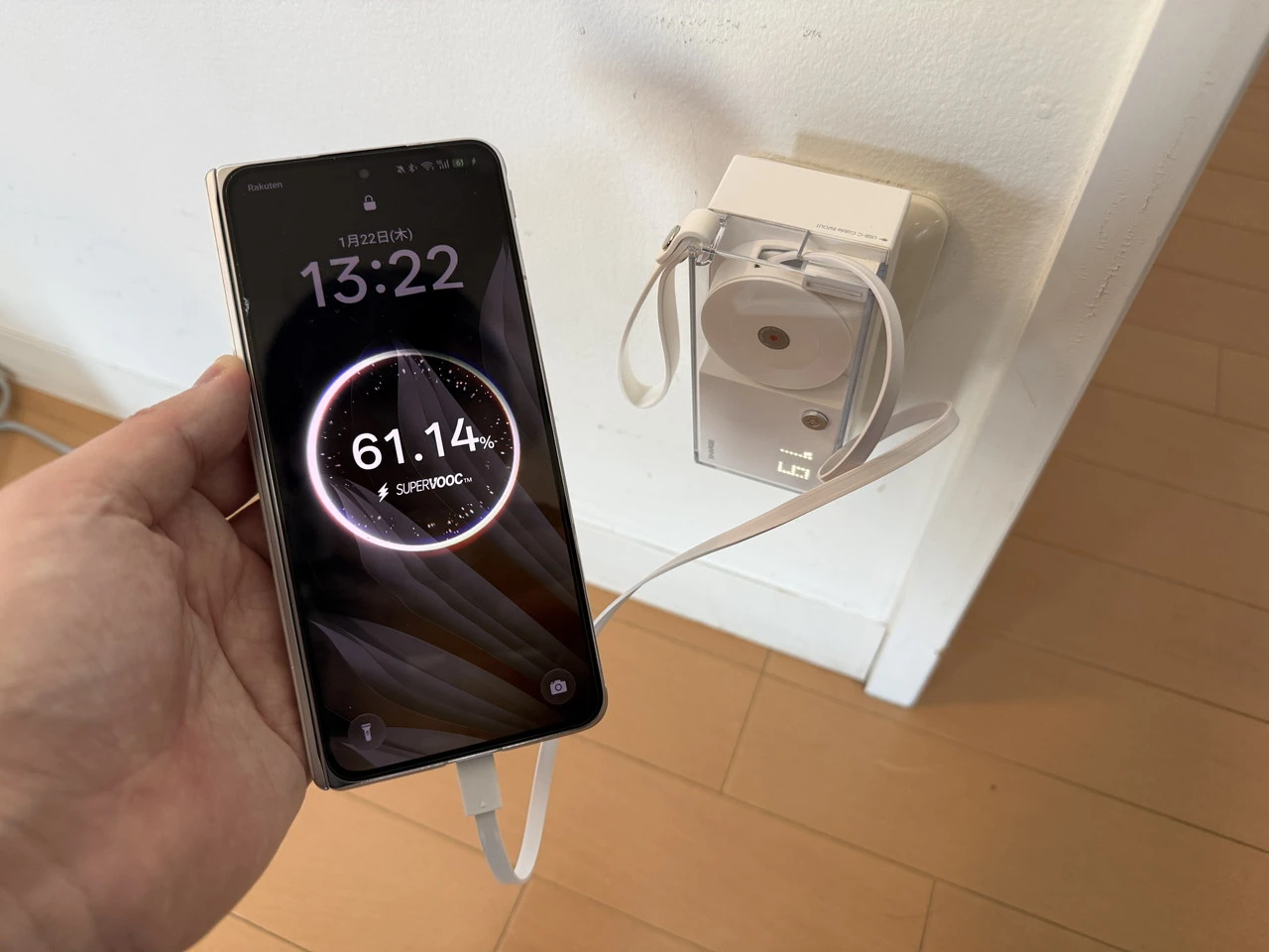 最大30W出力をサポートしており、5,600mAhバッテリーを備える「OPPO Find N5」に接続したところ、約20分で55%⇒90%近くまで高速充電できました。