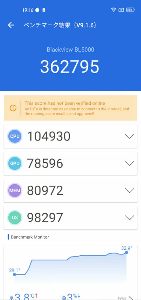 Dimensity 700搭載なのであまり性能は期待できないが、テストをしてみたところAntutu 9.1.2で362,795という結果だった。これはなんと以前レビューしたArmor 11Tと同等である。GPUのスコアは3万ほど低く、その代わりMEMとUXのスコアが高く、それで補っている結果。