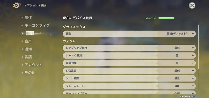▼原神は最低がデフォルト。レンダリング精度だけ高にすると良い