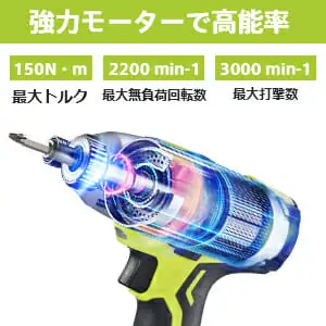 最大トルク:150N・m 最大無負荷回転数:2200rpm 最大打撃数:3000bpm 充電式インパクトドライバーとしてはかなりプロスペック、作業効率・耐久性に優れています。