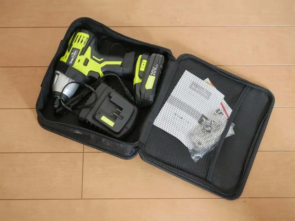 付属している収納バッグは布製で内部にマジックバンドでインパクトドライバー本体が固定できて充電器も収納可能です。蓋側にポケットがあるのでビットなどの小物も収納できて便利ではありますが、個人的にはハードケースの方が良かったです。