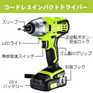 SnapFresh コードレスインパクトドライバーの特徴を4点あげます、比較的安価なインパクトドライバーではありますが、なかなかの高機能です。