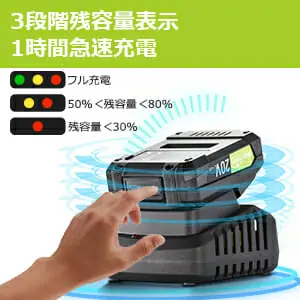 急速充電器とバッテリーが1個付属しています、充電は1時間でフル充電ができますので日常の用途であればまったく問題はありません。充電レベルもバッテリーのボタンを押せば残量の確認が可能です。