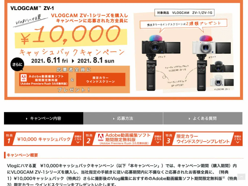 現在本機を新規購入し、専用フォームから応募するともれなく¥10,000キャッシュバック、Adobeの編集ソフト3ヶ月無料版体験、限定カラーウインドスクリーンが貰えます。