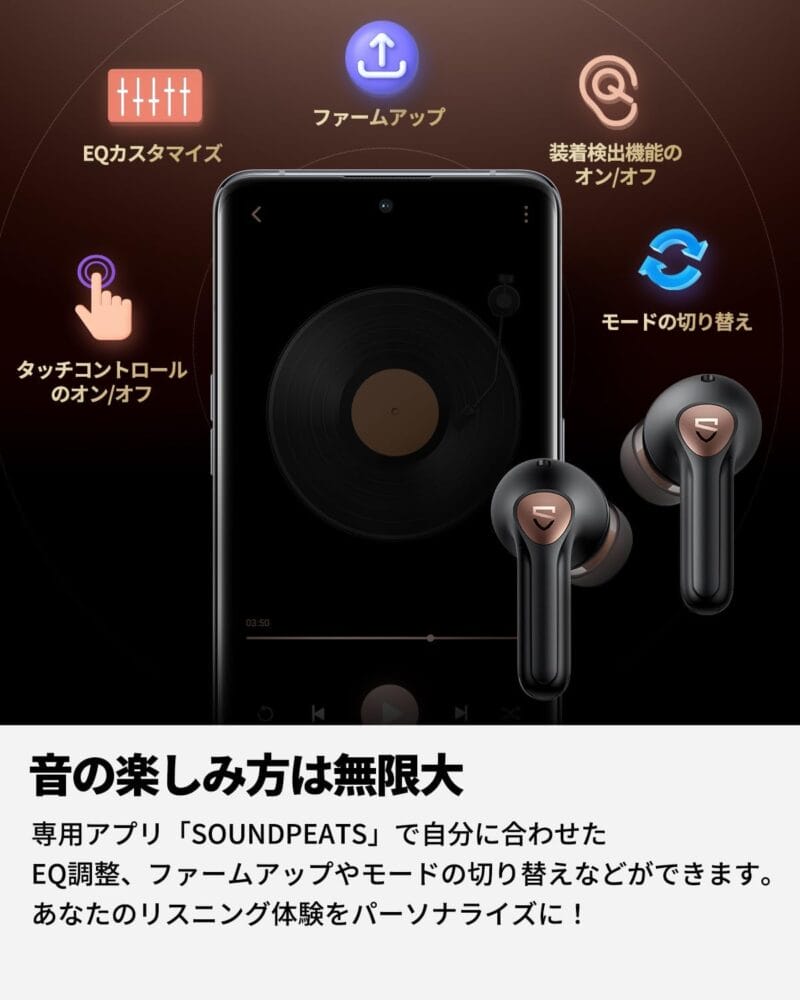 専用アプリ「SOUNDPEATS」に対応し、イヤホンのステータス表示や設定変更が可能。EQ(イコライザー)機能も搭載しており、低音や高音を強調/抑制したり、プリセットのサウンドモードを変更することで、ユーザーに最適なリスニング環境を提供する。