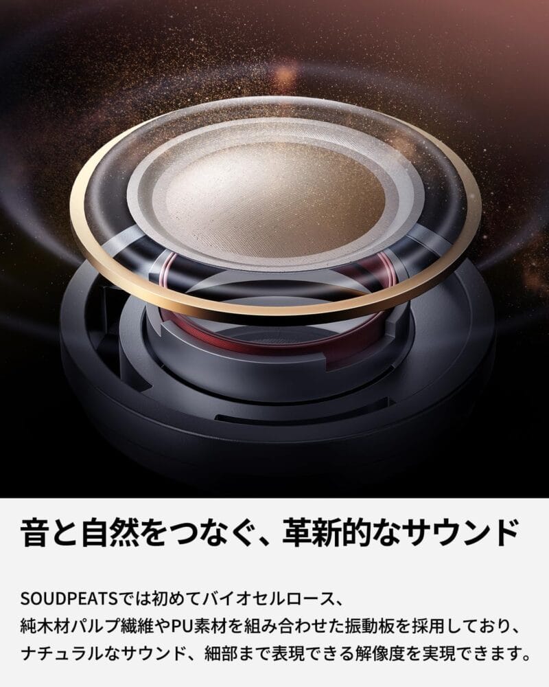 「Air4 Pro」の 13mm大口径ダイナミックドライバーには、独自開発のバイオセルロース複合振動板が搭載されている。バイオセルロースにパルプ繊維、PU材料という特性が異なる3つの素材を組み合わせることにより、硬さと軽さを確保しつつ、内部損失の少ない振動板へと仕上げられている。また、異なる材料の特性を最大限に生かし、クリアな中音域と、ダイナミックかつナチュラルなサウンドを実現する。