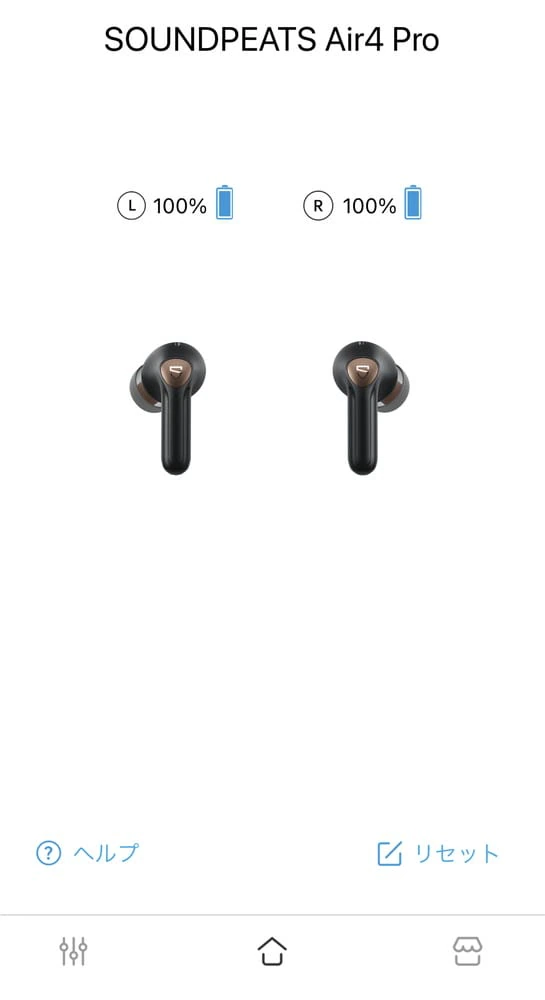 ▼アプリ画面。イヤホンの充電残量や接続状態、音質に関する各種パラメータの調節などを行うことが出来る。