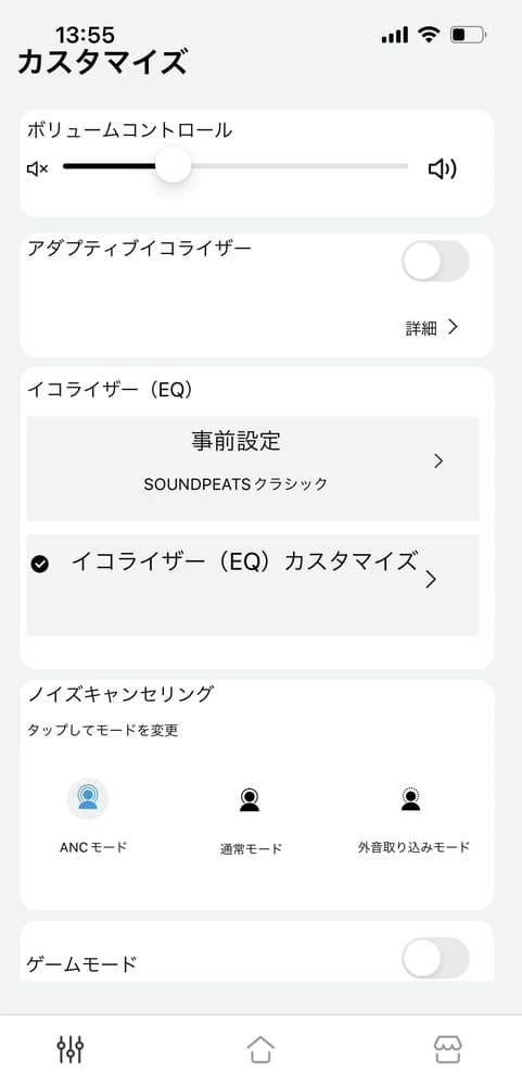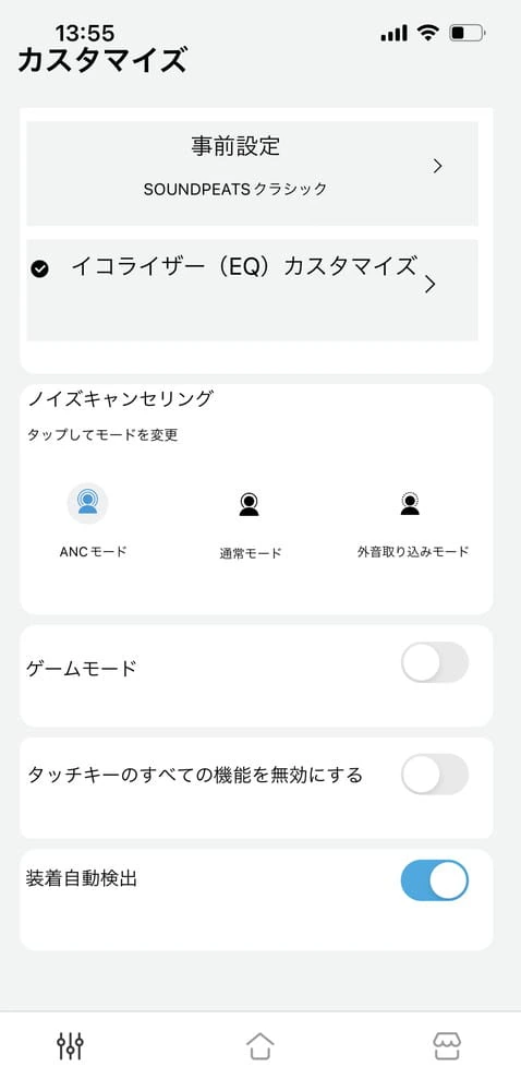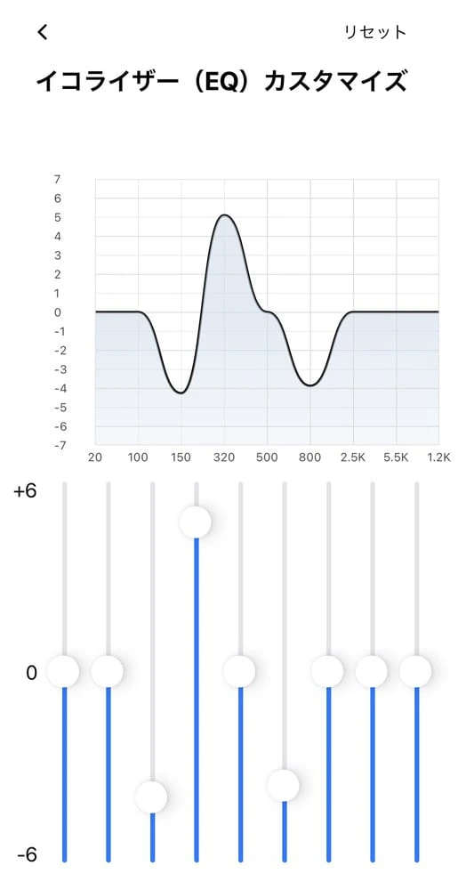 公式アプリにはイコライザー(EQ)調節機能が用意されており、イヤホンの音質を自分好みにカスタマイズすることが出来る。
