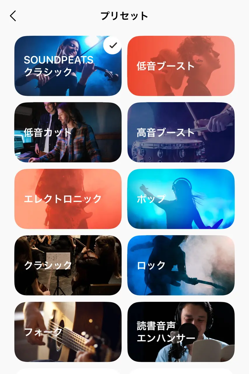 音響にあまり詳しくない方にとって、イコライザーをイジるのは敷居が高いですが、このようにプリセットがいくつも用意されているおかげで、音の変化を気軽に楽しめるのは嬉しいです。