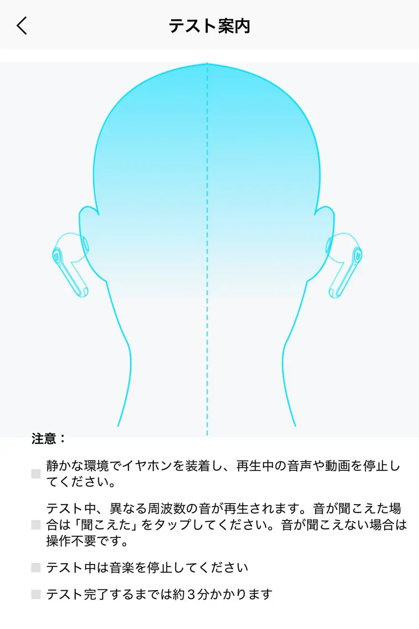 アダプティブイコライザーでは、周囲の環境に応じて最適な視聴環境を実現できます。静かな場所でイヤホンを装着し、約1分間のテストを実行することで、自動的に調節が完了します。