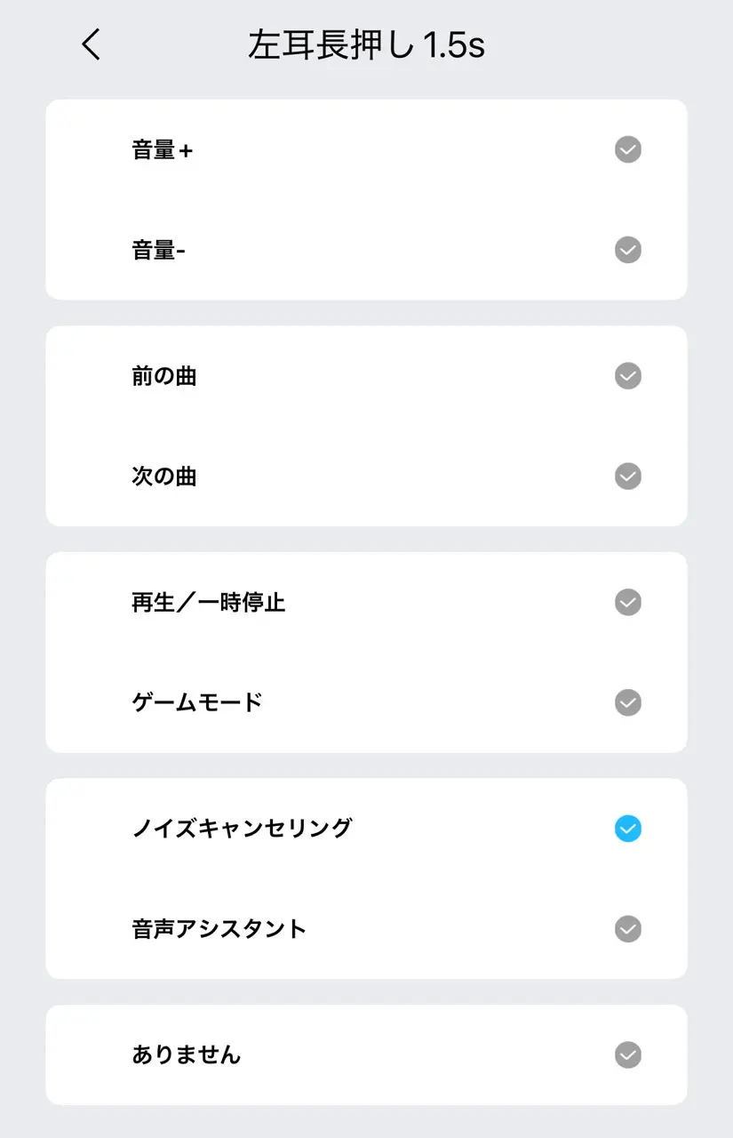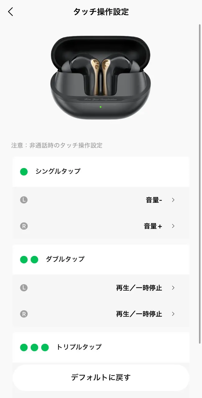 シングルタップ、ダブルタップ、トリプルタップ、長押しの各操作に対し、電源ON/OFF、音量調節、曲送り/曲戻しなどの機能を割り当てることができます。