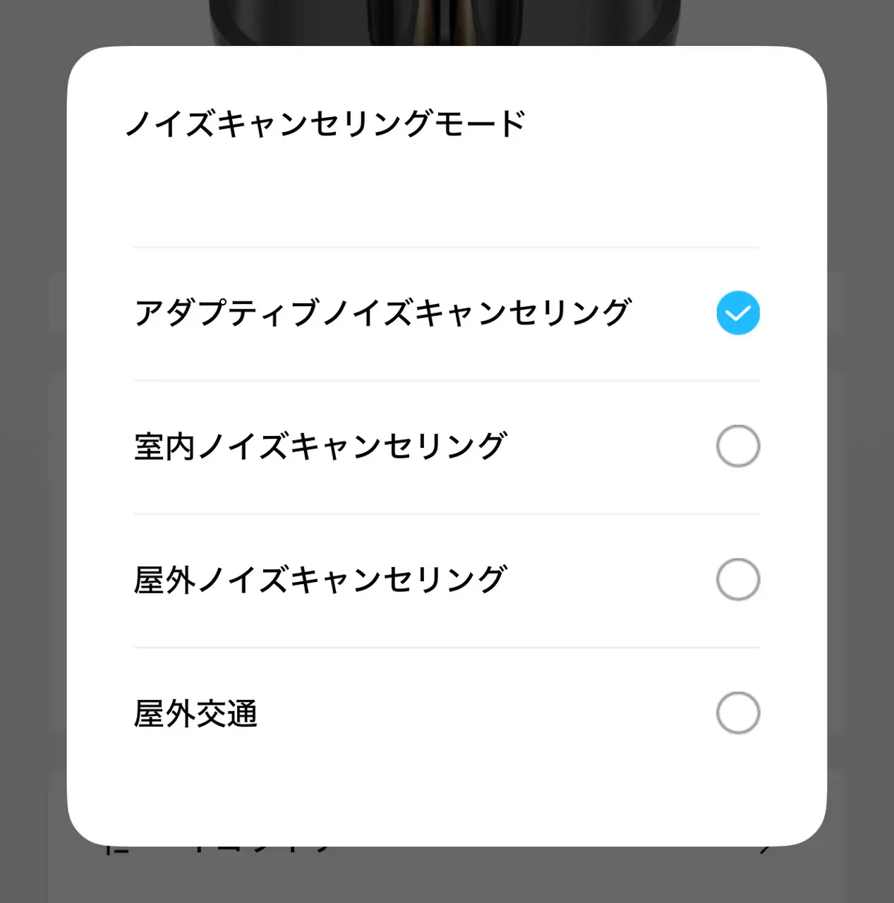 周囲の環境に応じて、複数のモードから好みのノイキャンモードを選択可能。周囲の環境に応じて自動的にノイキャン強度を調節するアダプティブモードも用意されています。