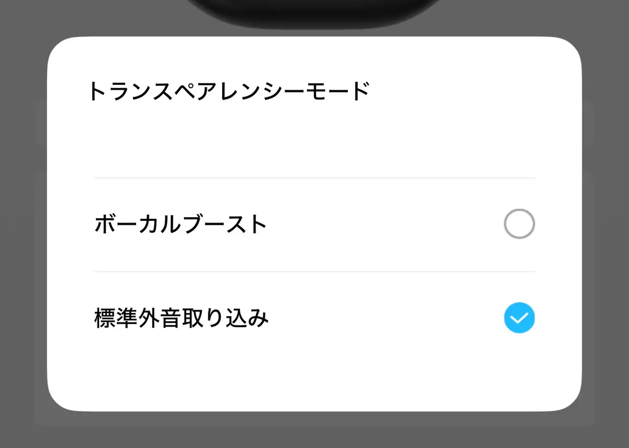 外音取り込みモードをオンにした場合、「ボーカルブースト」と「標準外音取り込み」のモードを選択できます。