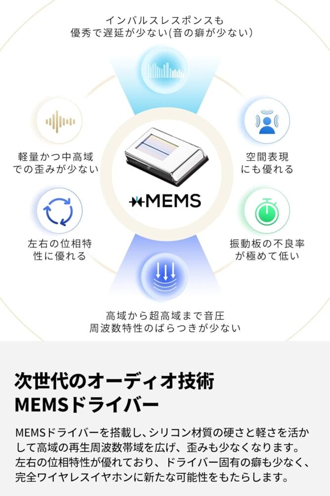 MEMSドライバー&12mmダイナミックドライバーによる躍動感と迫力のあるサウンド