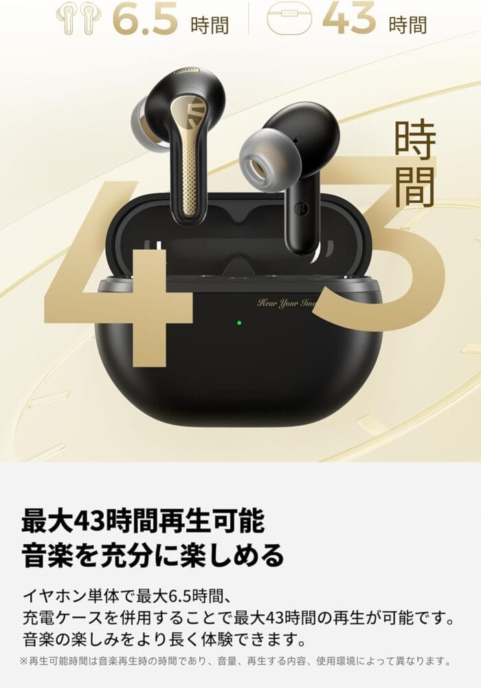 | 最大持続時間 | イヤホン単体:約6.5時間 ※60%音量 ケース込み:約43時間 ※60%音量 |