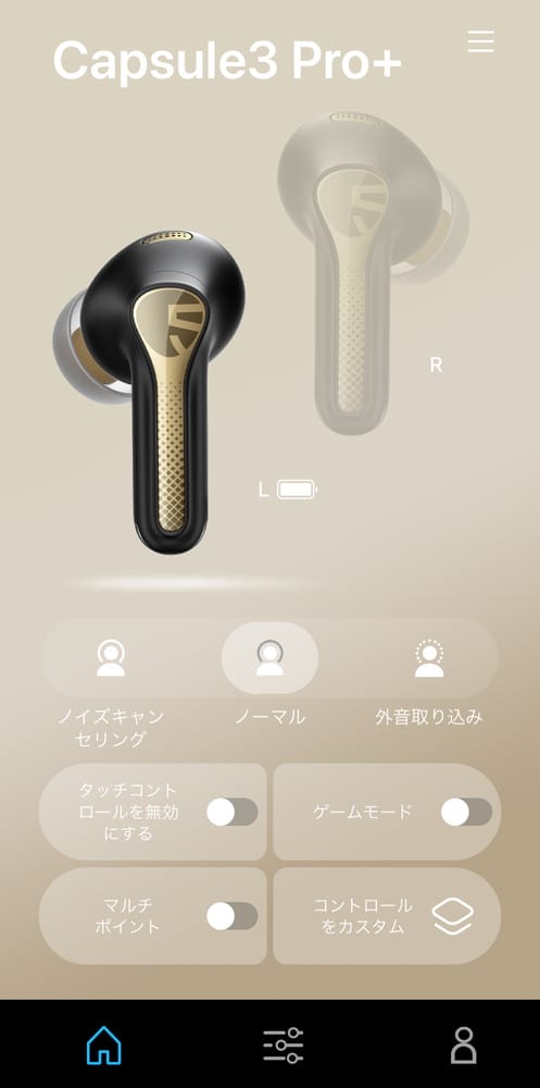▼アプリメイン画面。イヤホンの充電残量や接続状態、音質に関する各種パラメータの調節などを行うことが出来る。