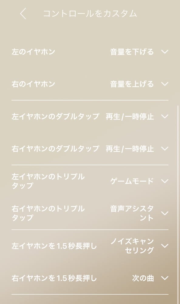 アプリ上では、イヤホン側面のタッチパネルを操作した際の機能を自由にカスタマイズすることができる。